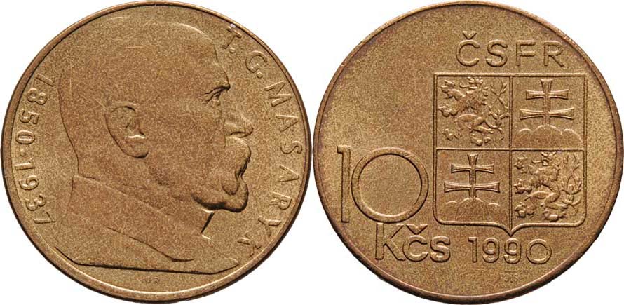 10 Kčs 1990 - TGM, Sign.MR, var.a (bez tečky, svislé stojny písmene M, výška písmen cca 0.8mm), 7.935g, pěkná patina, téměř R!