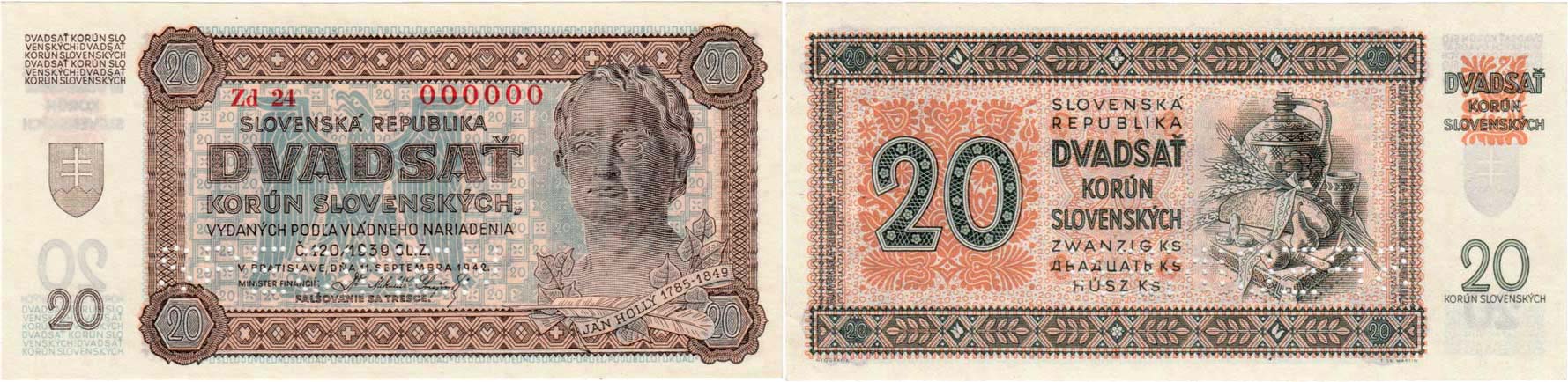 20 Koruna 1942, série Zd24 - anulát - bankovní vzor "000000", 1x "SPECIMEN", BHK.53s, Kar.49a