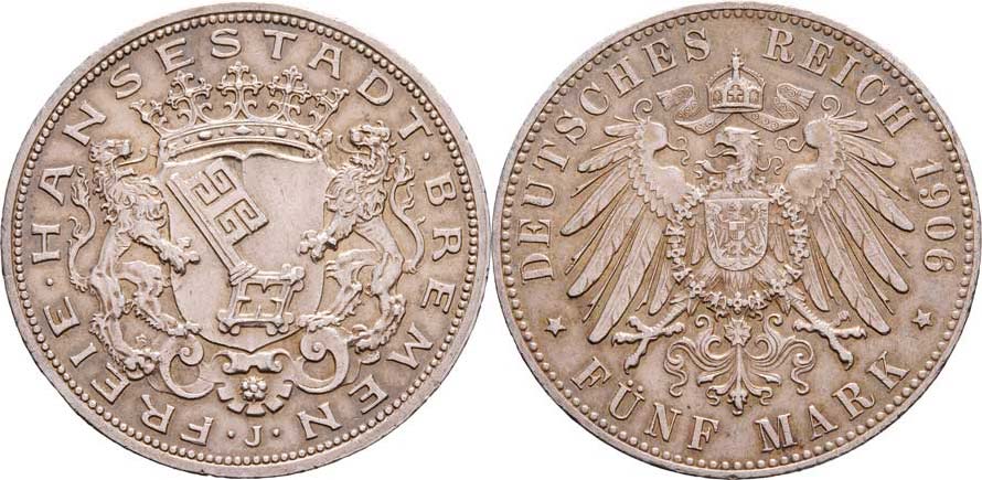 5 Marka 1906 J, KM.251 (pouze 41.000 ks), 27.701g, nep.hr., dr.rysky, pěkná patina, téměř R!