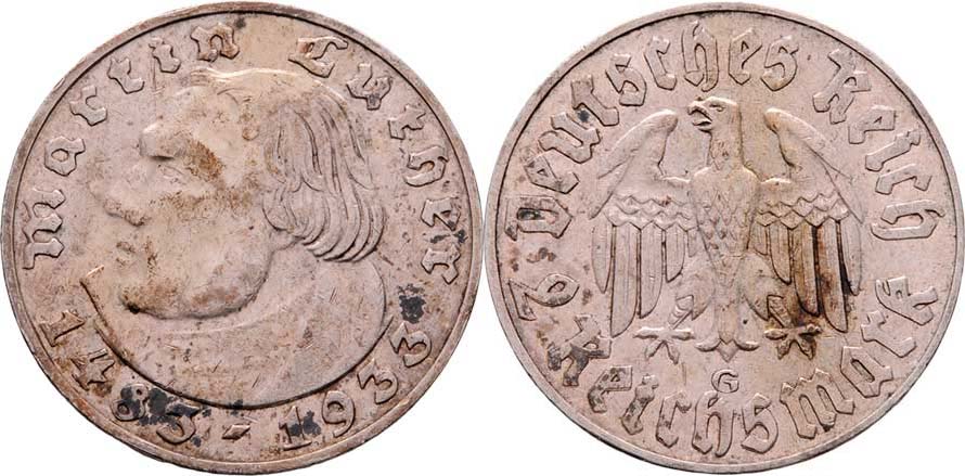 2 Marka 1933 G - Luther, KM.79 (Ag625, 61.000 ks), 8.028g, dr.hr., dr.rysky, skvrnky, patina R!