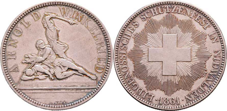 5 Frank střelecký 1861 - Nidwalden, KM.S6 (raženo pouze 6.000 ks), 24.976g, nep.hr., dr.rysky, pěkná patina R!