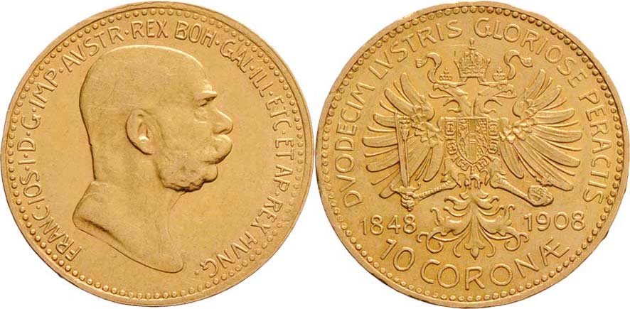 10 Koruna 1908 - jubilejní (3.374g), 1909 Marschall (3.369g), dr.hr., nep.rysky, patina, téměř 2ks