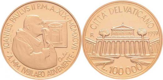 100.000 Lira 1997 R - průčelí basiliky svatého Pavla, Y.289 (Au917, 15.00g, pouze 6.000 ks), kapsle RR!