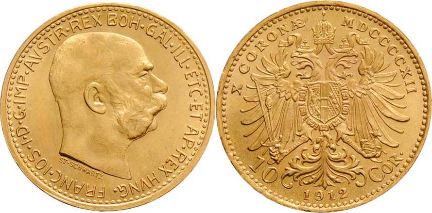 10 Koruna 1911 - Schwartz (3.381g), 1912 - novoražba (3.381g), nep.hr., nep.rysky, pěkná patina, téměř 2ks
