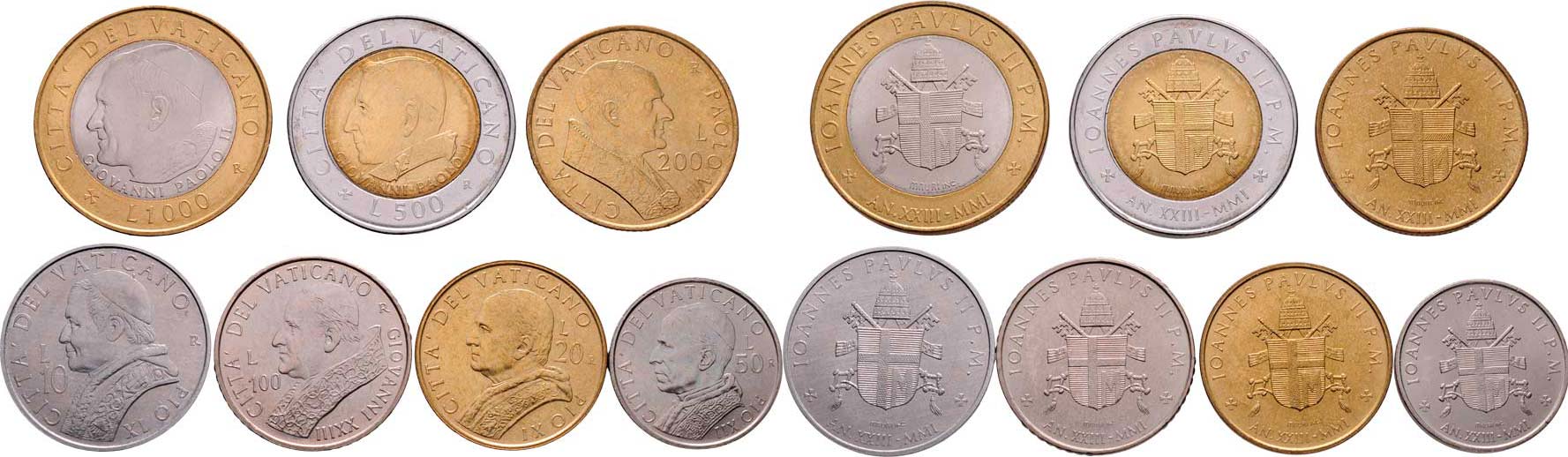 Soubor drobných mincí 2001: 1000,500,200,100,50,20,10 Lira, Y.337,336,335,334,333,332,331, nep.hr., nep.rysky 7ks