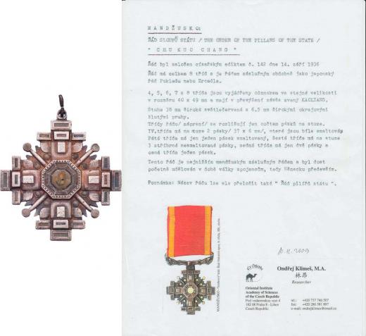 Řád Sloupů státu (založ.1936) - VIII.třída, BB.545, poškozený smalt, bez závěsného ráhna a stuhy, přilož. popis Ondřeje Klimeše M.A. z Orientálního ústavu ČSAV