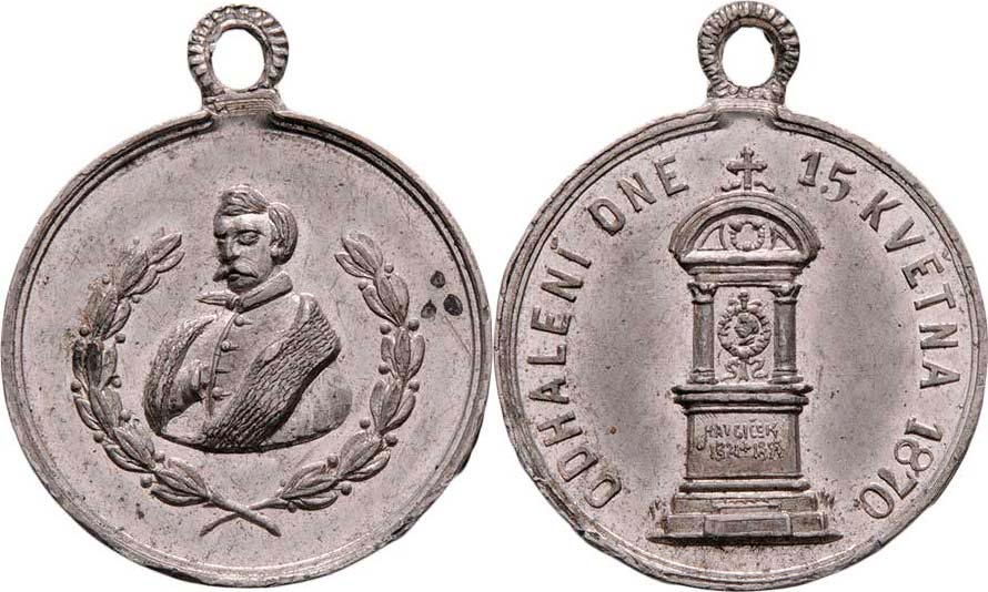 K.H.Borovský - odhalení pomníku na Olšanech 15.5.1870 - poprsí zleva ve vavřínovém věnci / pomník a opis, cín 24 mm s původ.ouškem, Don.3405, Hau.2262, dr.hr.