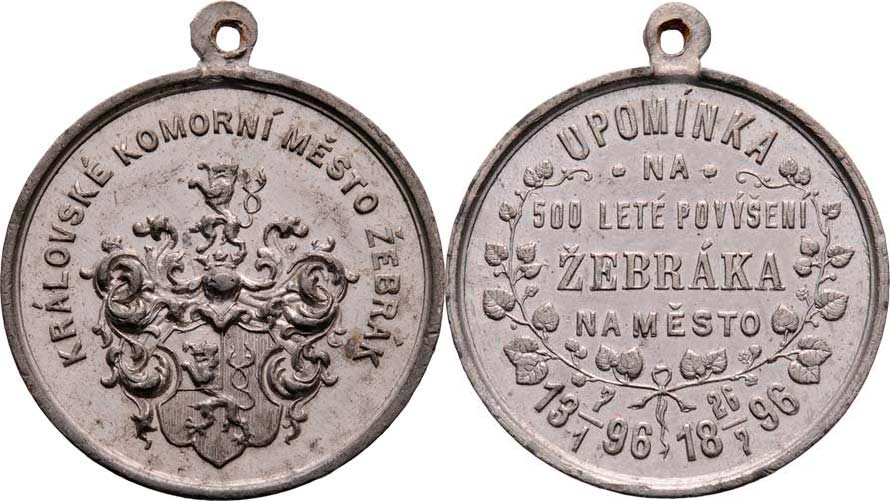 Upomínka na 500.výročí povýšení na město 26.7.1896 - městský znak, český opis / 6-řádkový český nápis, lipový věnec, Nesign., cín 29 mm s raženým ouškem