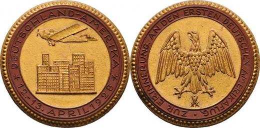 Míšeň - let letadla Bremen do Ameriky 1928 - orlice, opis / letadlo nad městem, opis, zn.porcelánky, částečně zlacený hnědý porcelán 42 mm R!