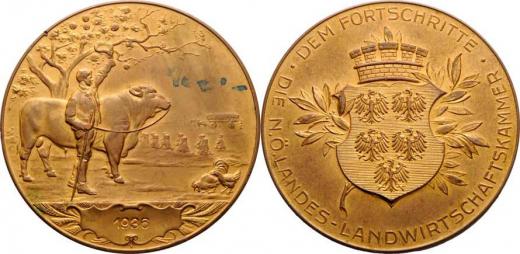 Dolnorakouská hospodářská komora - Zásluze 1936 - zemský znak, vavříny, opis / hospodář s býkem, drůbež a krajina, Nesign., zlacený bronz 55 mm, dr.hr., skv.