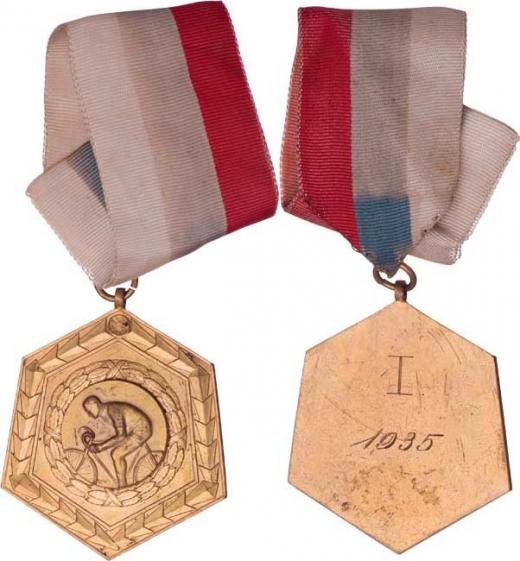 Slovensko 1935 - Cyklistické závody - I.místo, Nesign., zlacený bronzový šestiúhelník 50x56 mm se závěsem a stuhou