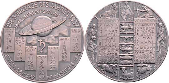 Prinz - AR kalendářní medaile na rok 1937 - planeta Saturn, kalendář, opis/ znamení zvěrokruhu, kalendář, ozn.minc.Vídeň, Punc., 40mm, 18.110g, patin., etue