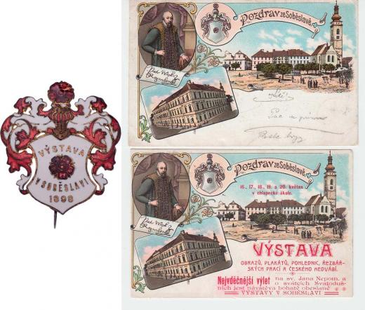 Soběslav 1898 - Výstava obrazů, plakátů, pohlednic, ....., Nesign., smaltovaný zlacený bronz 30x35 mm se zavíracím špendlíkem, dvě související pohlednice