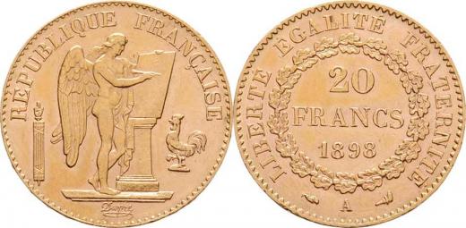 20 Frank 1898 A, KM.825 (Au900), 6.430g, nep.hr., nep.rysky, téměř