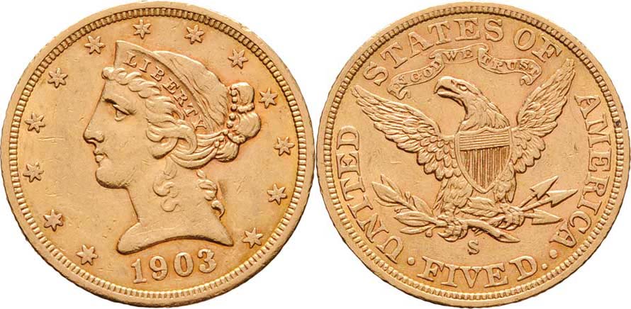 5 Dolar 1903 S - hlava Liberty, KM.101 (Au900), 8.351g, nep.hr., nep.rysky, pěkná patina, téměř