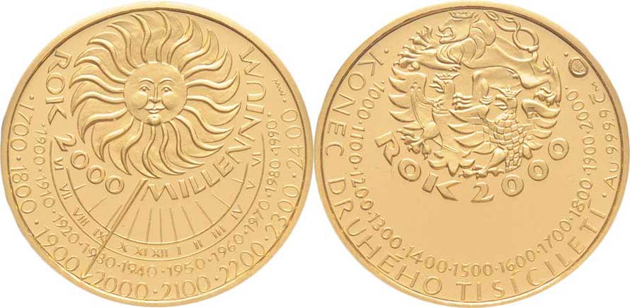 Wichnerová - konec druhého tisíciletí 2000 - styliz. znak, trojitý opis / slunce, kalendář, opis, Sign.MW, kapsle, etue, certifikát (Au999, 23mm, 7.78g, 300ks)
