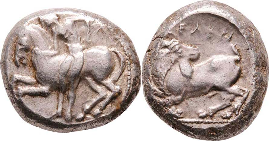 AR Stater, Mladík stojící vedle koně / kozel zleva s hlavou otočenou vpravo, nápis, podobný jako SG.5533, BMC.55.22, 10.848g, mírně exc., pěkná pat.
