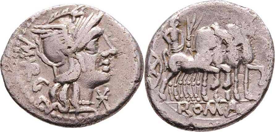 AR denár, Hlava Romy zprava, "M.VARG.X." / Jupiter na quadrize doprava, nápis "ROMA.", Crawford.257/1, Seaby.Vargunteia.1, Arn.980, oválný střížek, patina