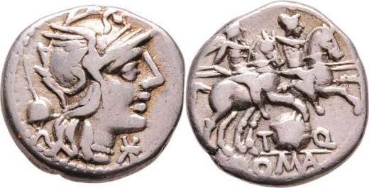 AR Denár, Hlava Romy, apex, značka "X" / dioscuriové na koních, makedonský štít, nápis "T.Q.ROMA.", Craw.267/1, Seaby.Quinctia.2, Alb.1014, patina