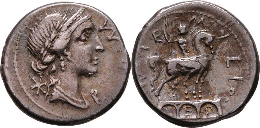 AR Denár, Hlava ženy zprava, opis "ROMA.X." / socha jezdce, nápis "MN.AEMILIO.LEP.", Crawford.291/1, Seaby.Aemilia.7, Alb.1074, nedor., pěkná patina