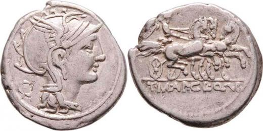 AR Denár, Hlava Romy zprava / Victoria na trize zprava, nápis "T.MAL.AP.CL.Q.VR.", Cravford.299/1b, Seaby.Manlia.1, Alb.1090, nepravidelný okr., patina