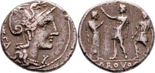 AR Denár, Hlava Romy zprava, opis "ROMA.P.LAECA.X."/ tři vojáci, náp."PROVOCO.", Crawford.301/1, Alb.1092, Seaby.Porcia.4, mírně exc., mírně kor., patina