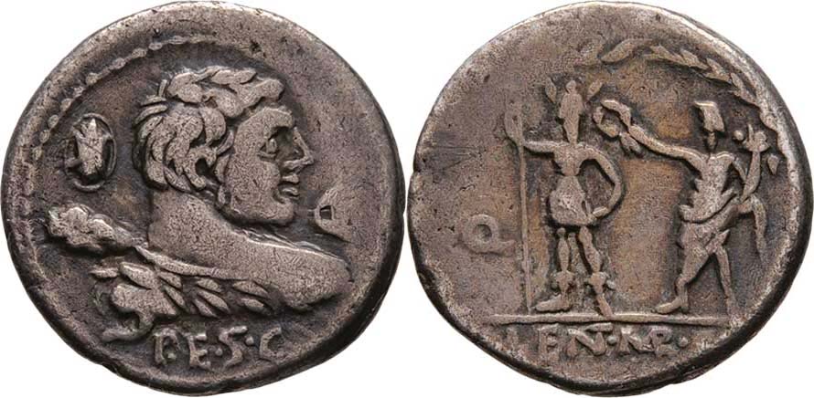 AR Denár, Herakles s kyjem a štítem, nápis "PESC." / Roma věnčící Genia s kopím, nápis "LENT.MAR.Q.", Crawford.329/1d, Seaby.Cornelia.26, Alb.1136, nedor.