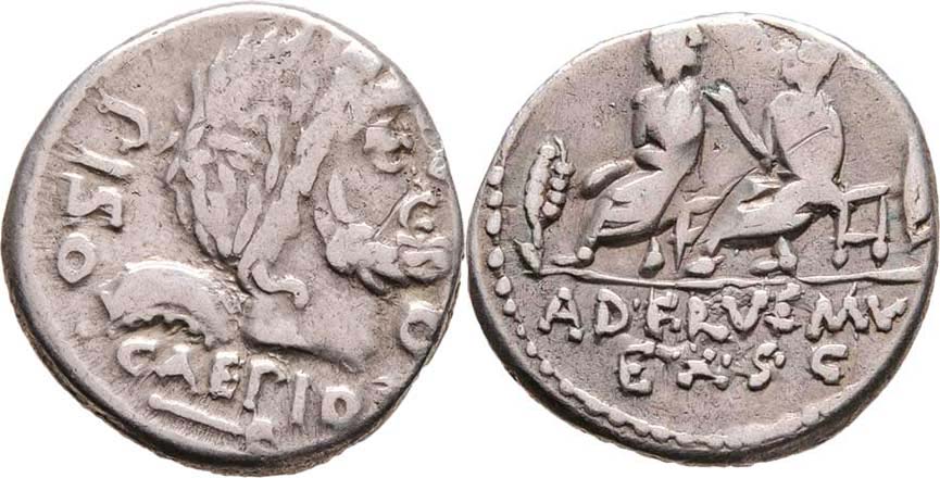 AR Denár, Hlava Saturna zprava, opis "PISO.CAEPIO.Q." / dva sedící questoři, nápis "AD.FRV.EMV.EX.S.C.", Crawford.330/1a, Seaby.Calpurnia.5, Alb.1138, exc.