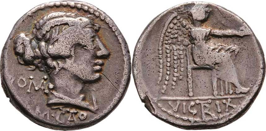 AR Denár, Hlava Romy zprava, nápis "ROMA.M.CATO."/ sedící Victoria, nápis "VICTRIX.", Crawford.343/1b, Seaby.Porcia.5, Alb.1196, mírně exc., pěkná patina