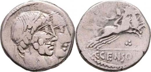 AR Denár, Hlavy Numy Pompilia a Anca Marcia zprava / dva jezdci zprava, "C.CENSO.", Seaby.Marcia.18, Crawford.346/1, Alb.1209, nedor., kontramarky, patina