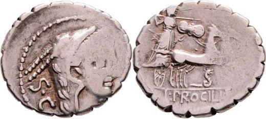 AR Denár - serratus, Hlava Junony, nápis "S.C."/ Juno na bize zprava, náp."L.PROCILI.F.", Seaby.Procilia.2, Crawford.379/2, Alb.1274, mírně exc., nedor., patina