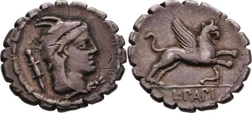 AR Denár - serratus, Hlava Juno zprava/ gryf ve skoku a nápis "L.PAPI.", zn."botička", Crawford.384/1, Seaby.Papia.1, Alb.1279, nep.exc., kontram., patina