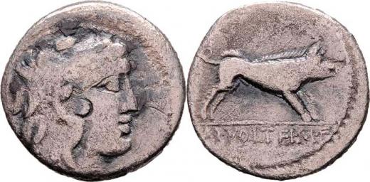 AR Denár, Hlava Herakla zprava / Erymanthijský kanec zprava, nápis "M.VOLTEI.M.F.", Seaby.Volteia.2, Crawford.385/2, Alb.1281, patina