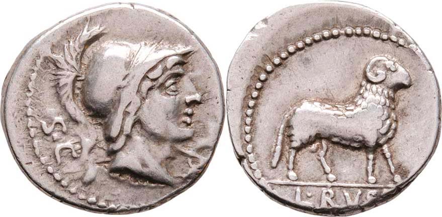AR Denár, Hlava Romy zprava "S.C." / beran zprava, nápis "L.RVSTI.", Crawford.389/1, Seaby.Rustia.1, Alb.1289, mírně exc., patina