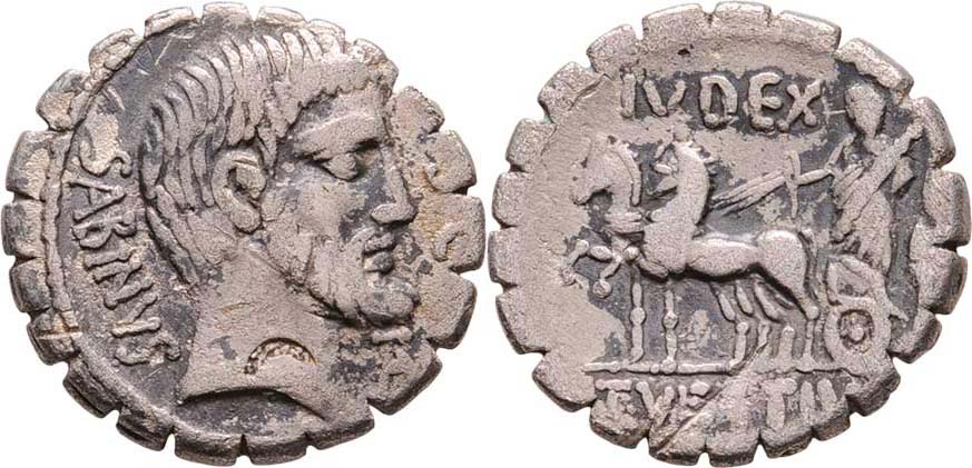 AR Denár-serratus, Hlava zprava, náp."SABINVS.S.C." / biga zleva, nápis "IVDEX.T.VETTIVS", Crawford.404/1, Crawford.404/1, Seaby.Vettia.2, Alb.1306, patina R!