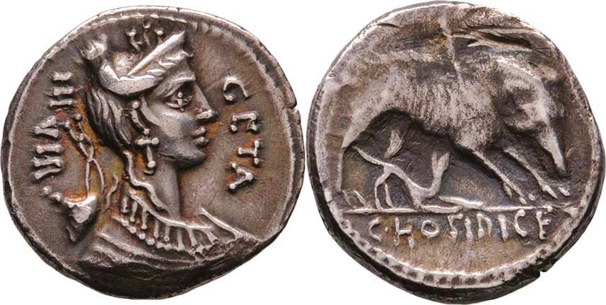AR Denár, Hlava Diany zprava, opis "GETA.III.VIR." / Kalydonský kanec se psem, nápis "C.HOSIDI.C.F." Crawford.407/2, Seaby.Hosidia.1, Alb.1314, patina