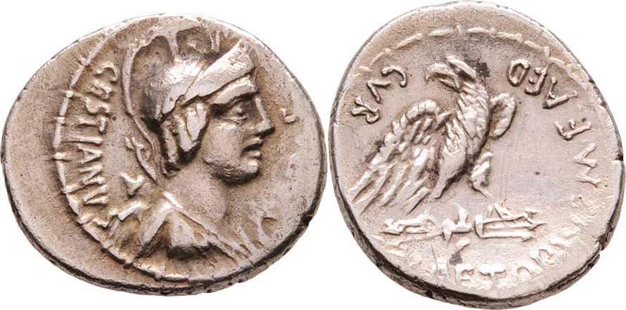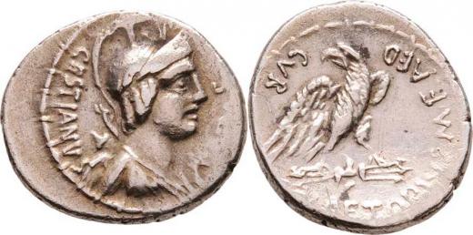 AR Denár, Hlava Vacuny zprava, opis "CESTIANVS.S.C."/ orel na blesku, opis "M.PLAETORIVS.M.F.AED.CVR.", Crawford.409/1, Seaby.Plaetoria.4, Alb.1316, exc.