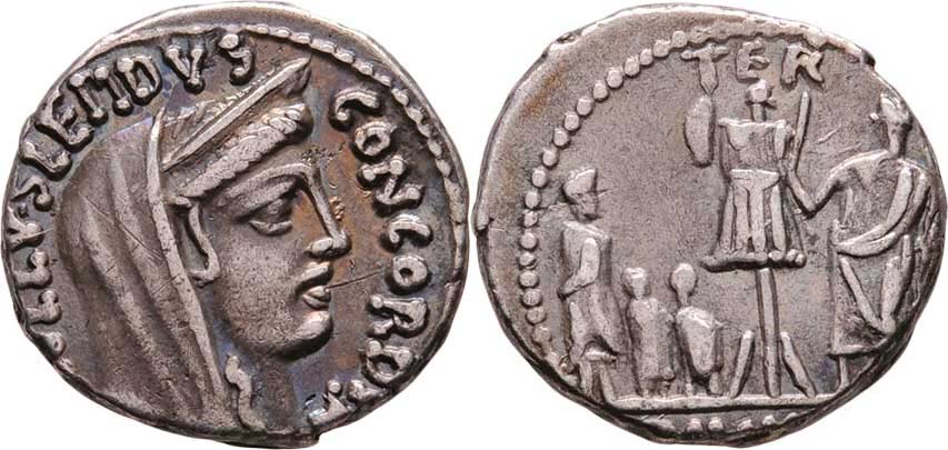 AR Denár, hl. Concordie, "PAVLLVS.LEPIDVS.CONCORDIA." / A.Paullus se syny a trofejí, nápis "PAVLLVS.TER." Crawford.415/1, Seaby.Aemilia.10, Alb.1332, nep.exc.