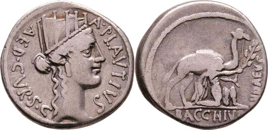 AR Denár, Hlava Cybele, "A.PLAVTIVS.AED.CVR.S.C." / Bacchius klečí před velbloudem, "BACCHIVS.IVDAEVS." Crawford.431/1, Seaby.Plautia.13, Alb.1359, patina