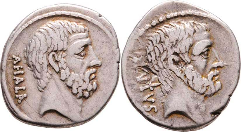 AR Denár, hlava Q.Bruta doprava, nápis "BRVTVS" / hlava Servilia Ahaly zprava, nápis "AHALA", Alb.1362, Seaby.Junia.30, Crawford.433/2, exc., pěkná pat. R!