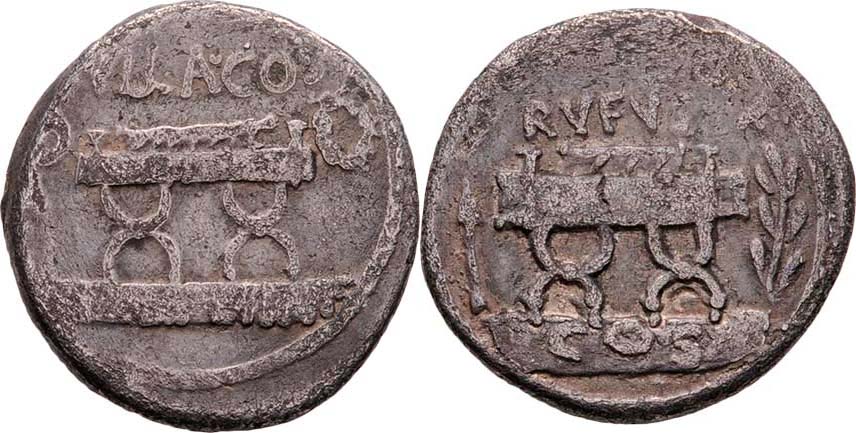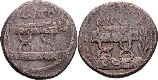 AR Denár, Curulské křeslo, "Q.POMPEI.Q.F.RVFVS." / curulské křeslo, "SVLLA.COS.Q.POMPEI.RVF.", Alb.1364, Seaby.Pompeia.5, Crawford.434/2, nedor., patina R!