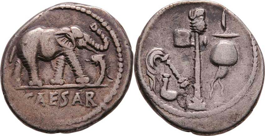 AR Denár, Slon zašlapávající hada, nápis "CAESAR." / obětní náčiní, Crawford.443/1, Seaby.49, Alb.1373, nep.nedor., mírně exc., pěkná patina