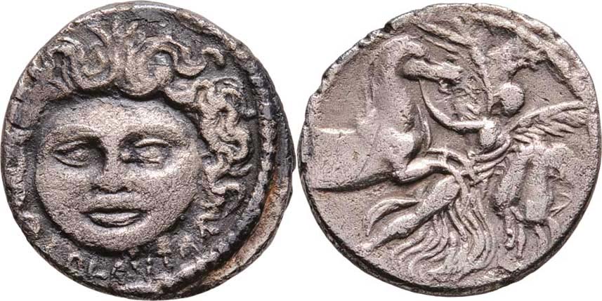 AR Denár, Hlava Medusy čelně, nápis "L.PLAVTIVS."/ letící Aurora s koňmi na uzdě "PLANCVS.", Alb.1409, Crawford.453/1a, Seaby.Plautia.14, exc., nep.kor. R!