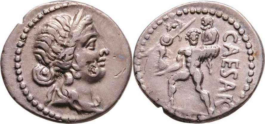 AR Denár, Hlava Venuše zprava / Aeneas nese Anchísa a paladium, nápis "CAESAR.", Seaby.12, Alb.1400, Crawford.458/1, africká mincovna, kontramarka, patina