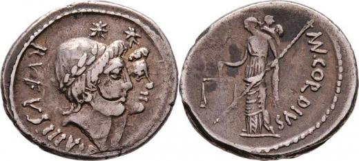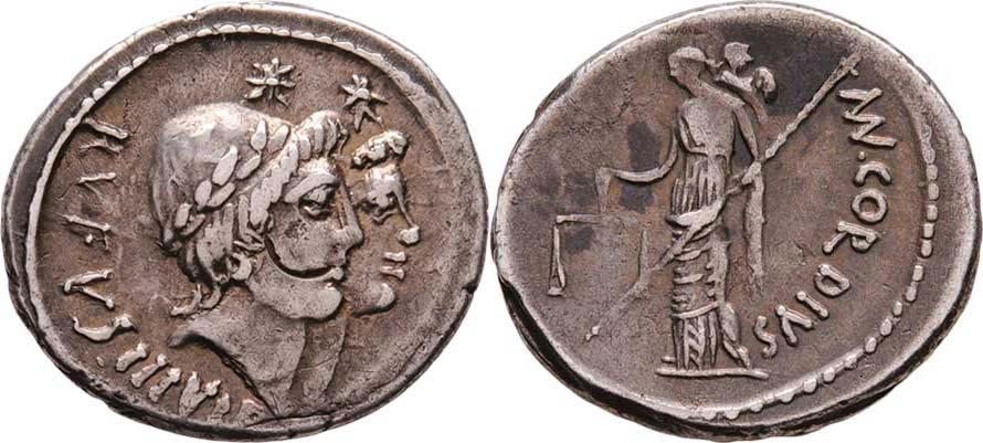 AR Denár, Hlavy Dioscuriů, nápis "RVFVS.III.VIR." / Venuše s Cupidem na rameni, opis "MN.CORDIVS." Crawford.463/1b, Seaby.Cordia.1, Alb.1428, exc., škr.