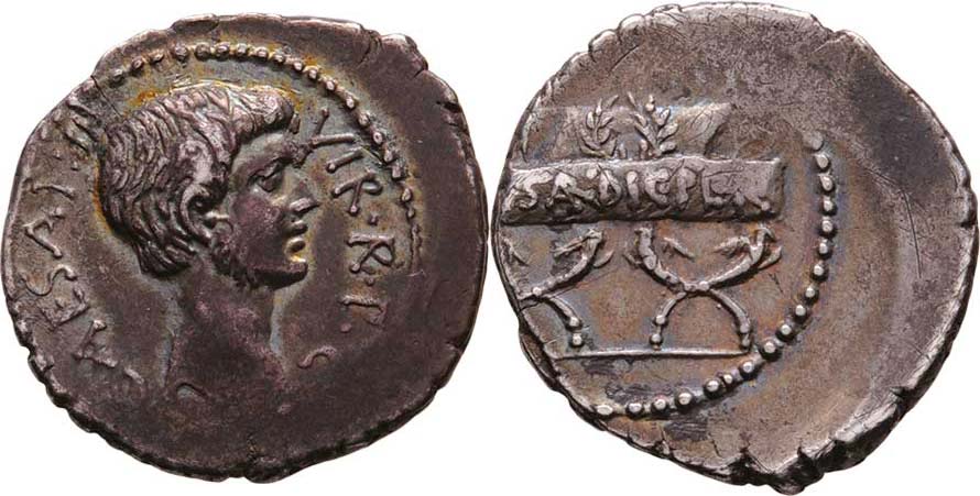 AR Denár, Hlava zprava, opis "CAESAR.III.VIR.R.P.C."/ věnec a nápis na curulském křesle "CAESAR.DIC.PER.", Crawford.497/2a, Seaby.55, Alb.1613, exc., patina R!