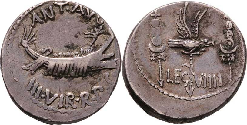 AR Denár, orel mezi standartami, nápis "LEG.VIIII." / galéra a opis "ANT.AVG.III.VIR.R.P.C.", Seaby.36, Crawford.544/22, Alb.1723, mírně exc., pěkná patina