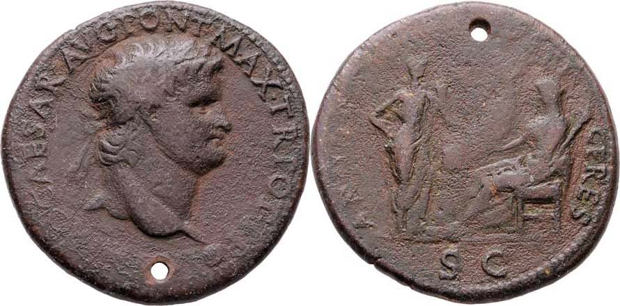 AE Sestercius, Rv:"ANNONA.AVGVSTI.CERES.S.C.", stojící Annona a sedící Ceres, S.578, RIC.571 - minc. Řím - ražba z roku 67, dírka, mírně kor., patina R!