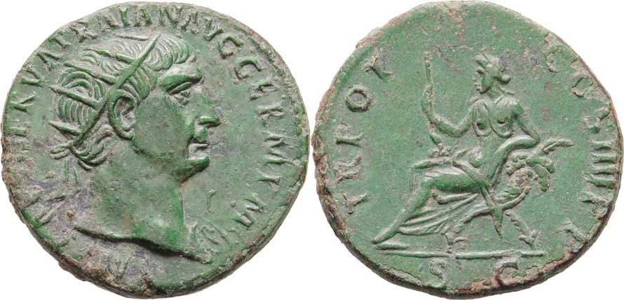 AE Dupondius, Rv:"TR.POT.COS.IIII.P.P.S.C.", sedící Abundantia, S.917, RIC.428 - mincovna Řím - ražba z let 101 - 102, krásná zelená patina