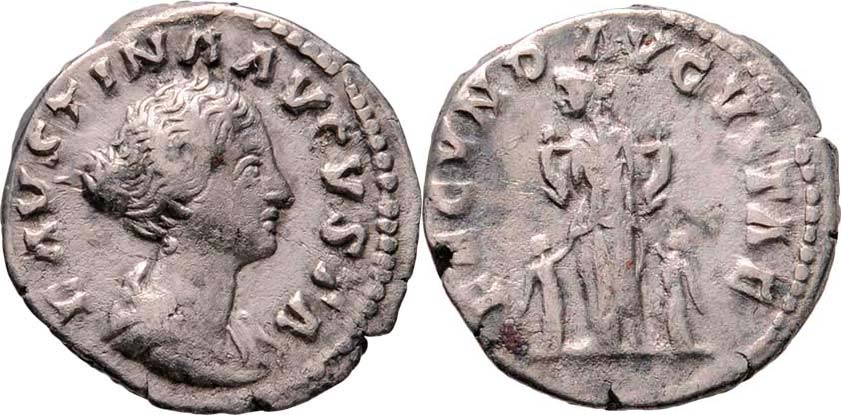AR Denár, Rv:"FECVND.AVGVSTAE.", Fecunditas mezi dvěma dětmi, S.1394, RIC.676 - mincovna Řím - blíže nedatován, nepravidelný okraj střížku, patina
